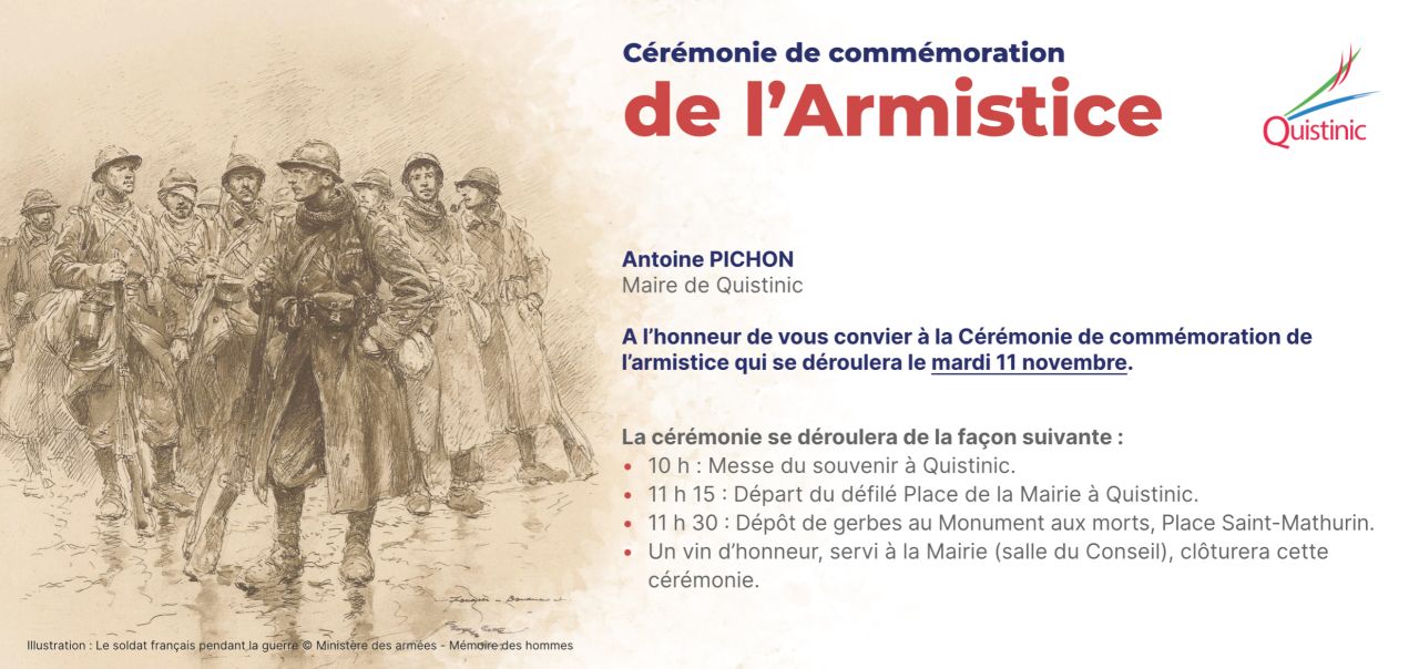 La municipalité de Quistinic invite toutes les familles et les enfants à participer à la cérémonie du 11 novembre dans le cadre des commémorations réalisées par toutes les communes de France pour l’Armistice et l’hommage aux Morts de toutes les guerres. Déroulement de la matinée en pièce jointe.