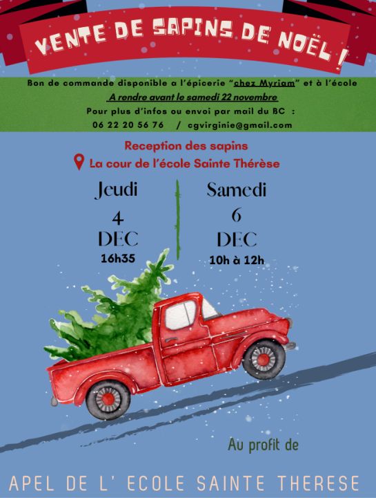 L'Apel organise une vente de sapins de Noël . Un bon de commande est disponible en pièce jointe. Date de retour des commandes : samedi 22 novembre. N'hésitez pas à passer commande ! Les sapins sont livrés à l'école (réception possible le jeudi 4 décembre à 16h35 ou le samedi 6 décembre de 10h à 12h). Pour tout renseignement, contactez le 06.22.20.53.76. Merci pour votre participation et votre aide à cette action !